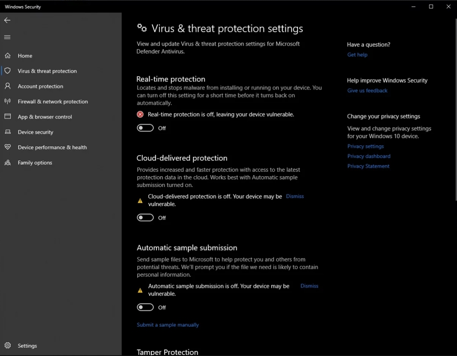 تحت Virus & Threat Protection Settings، اضغط على Manage Settings. وراح تظهر هذي الشاشة: