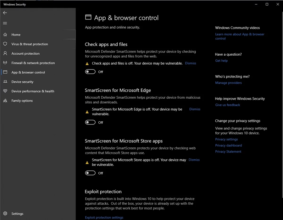 روح على App & Browser Control واطفي كل الخيارات الموجودة: